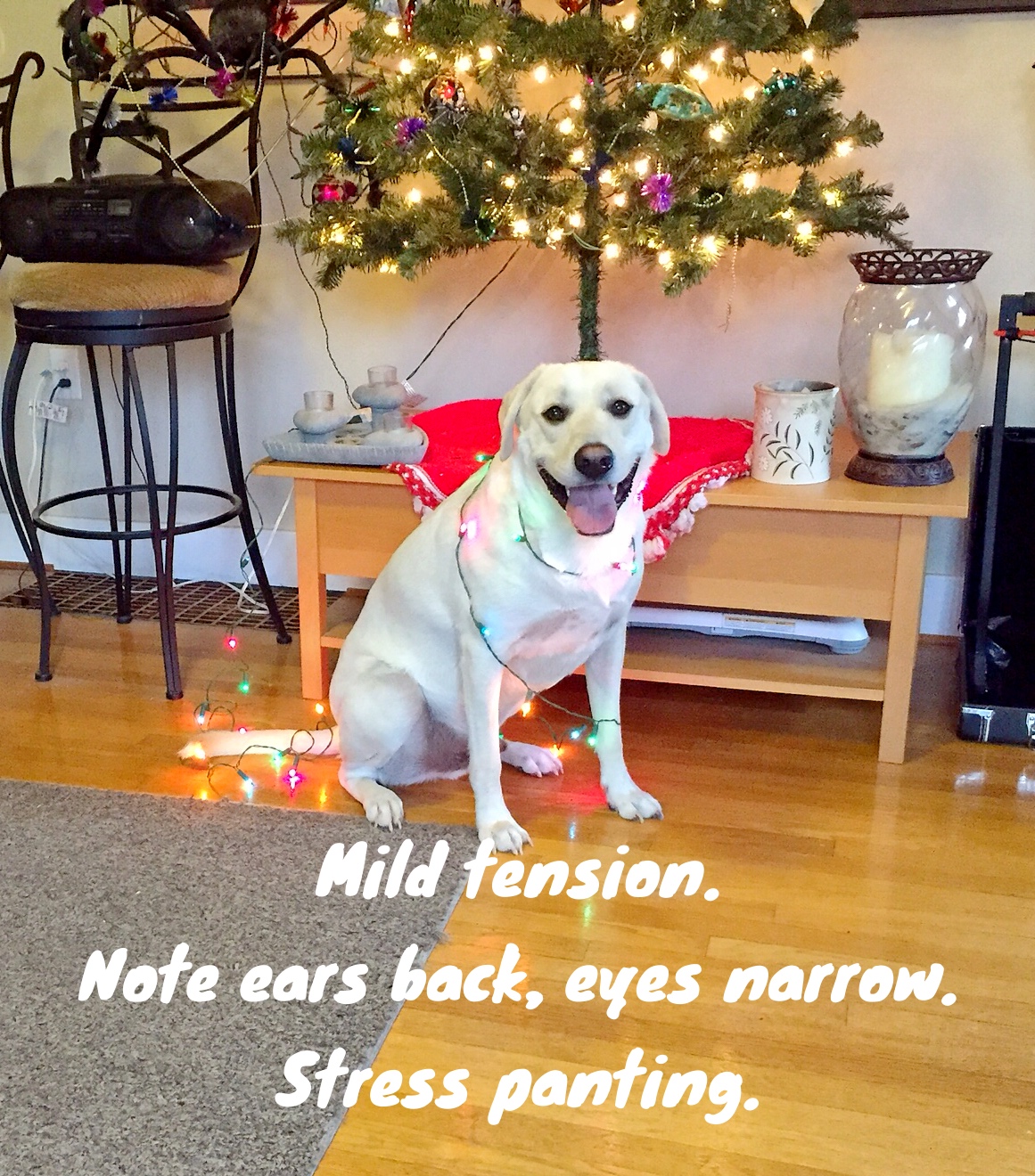 He’s looking at me with that big, goofy smile because he knows I’ve got yummy treats. I’ve asked him to Sit and Stay next to the new Blinky Stringy Thing, which means he has to remain in that position while I walk away. While Xander is just fine with this, for some dogs, being far away from Mama or Daddy while next to something potentially dangerous (at least in their eyes) is very stressful. Teach them to be less fearful by rewarding calm behavior as you slowly approximate them closer to a scary object while you move farther away. Baby steps!