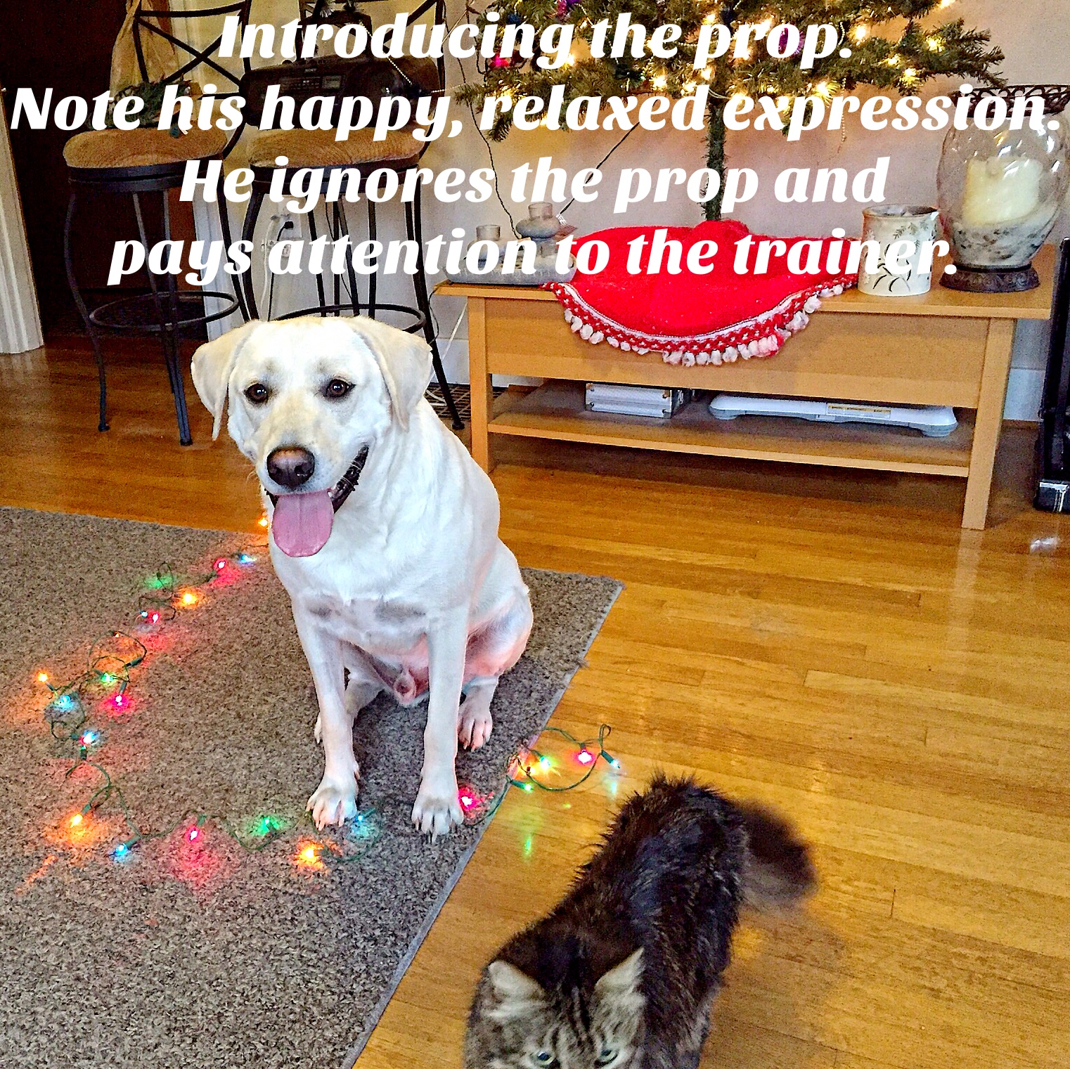 At each step of the way I gave Xander treats and verbal encouragement. In between each step I released Xander so he could get up, move around and relax. This is important! Allowing Xander to relax away from Blinky String, even for a few moments can be just as rewarding as a treat. I used those moments to give Xander a good scratch and some ear rubs.